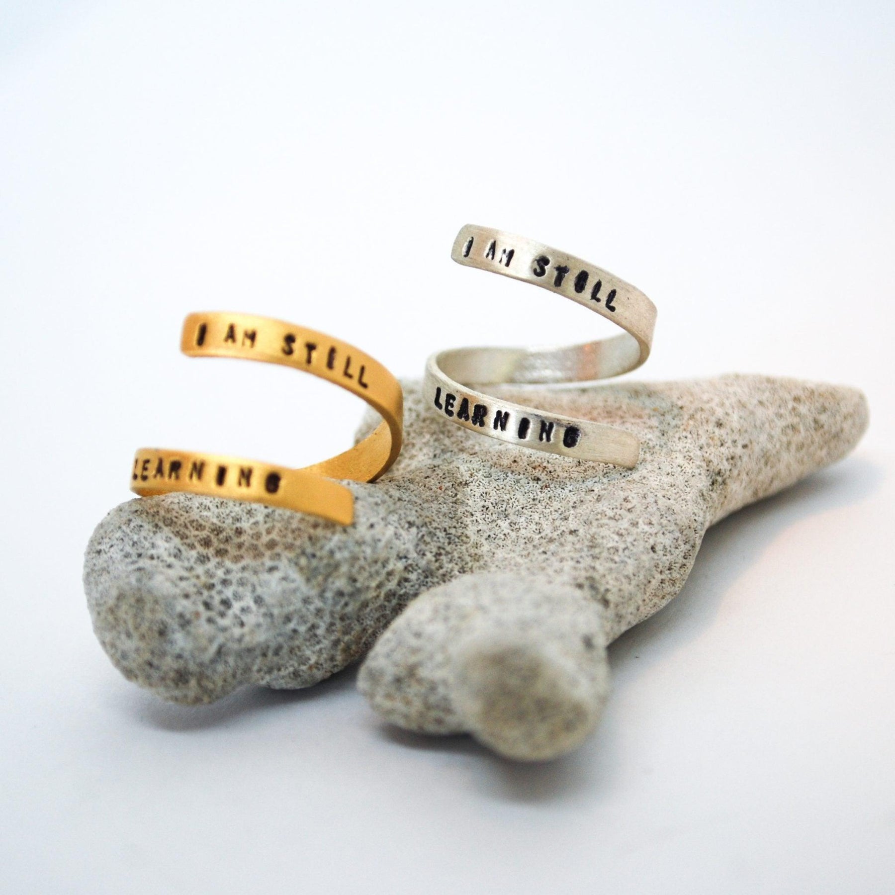 Hand forged and hand stamped by maker, Christine Street. lightweight, very comfortable, sterling silver and also available in 14kt gold vermeil. Fits sizes 4-9. Adjustable. Perfect for a graduation gift, birthday or other special occasion.