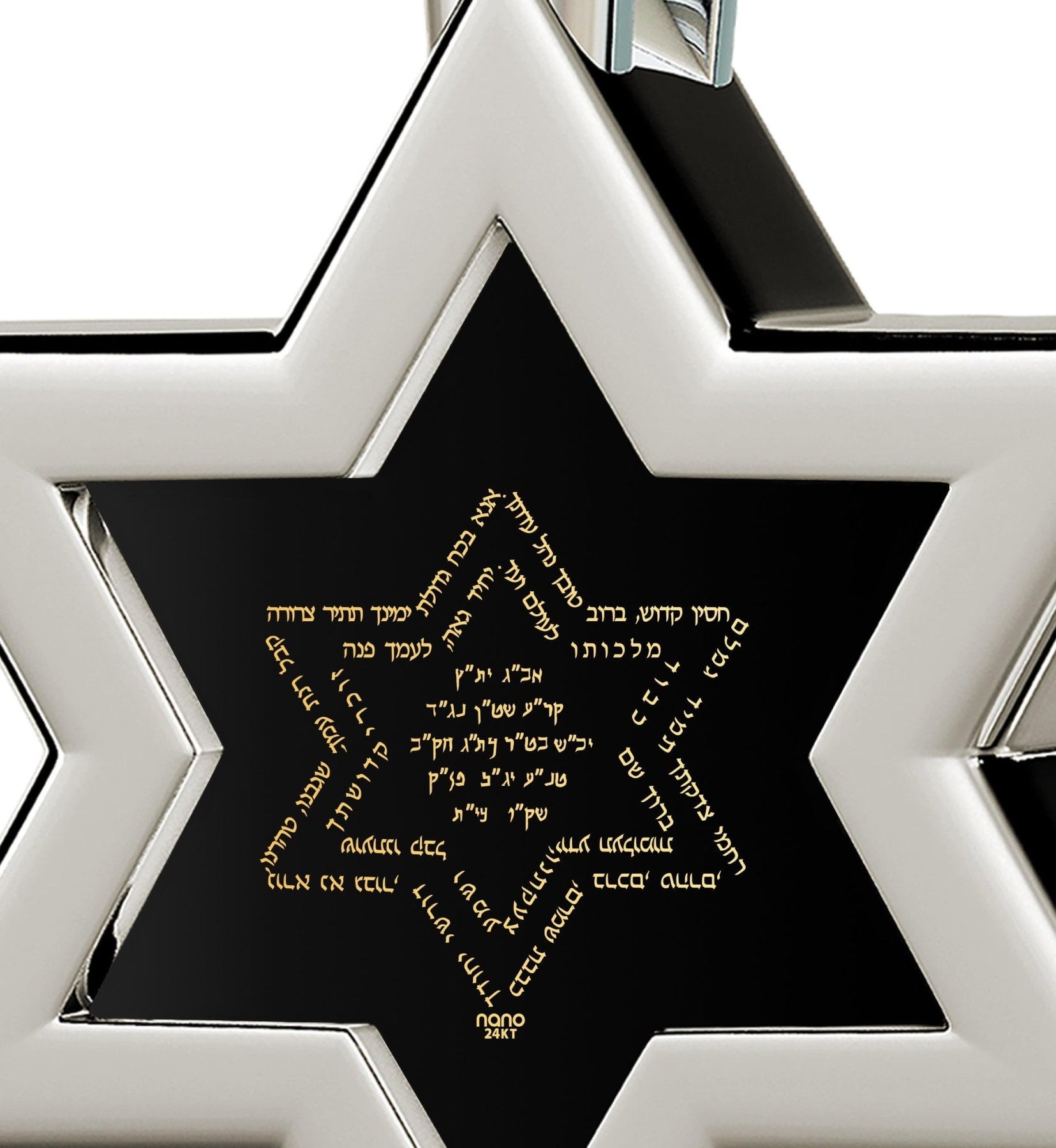 An elegant Star of David onyx pendant inscribed in 24k gold with Ana Bekoach, one of the most powerful prayers and spiritual blessings recited by Jewish people every day and on before an important occasion in order to elevate beyond the five senses, give strength and channel another spiritual dimension.