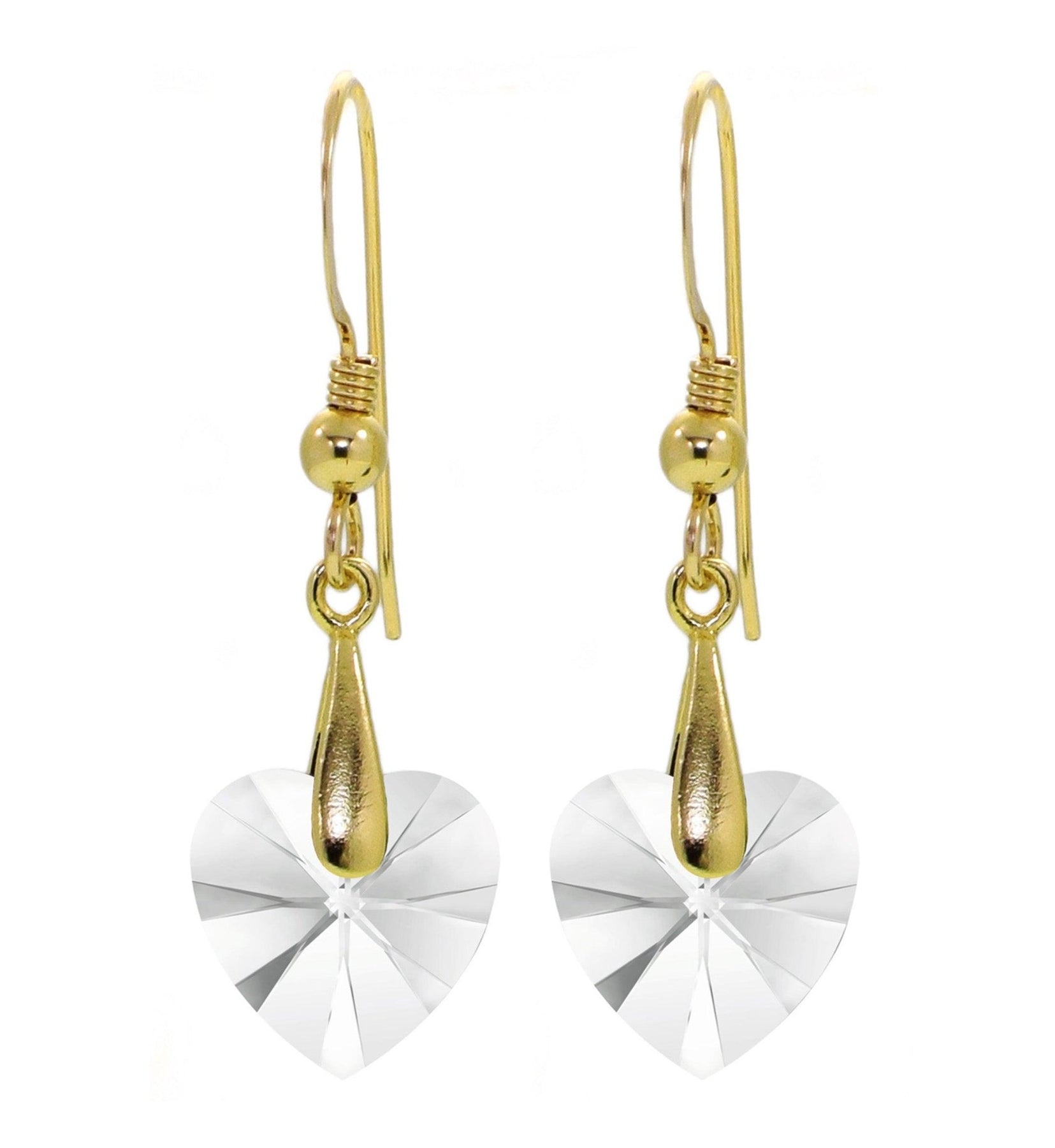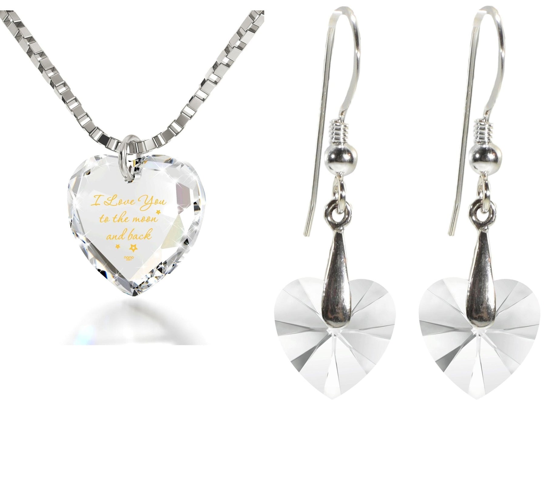 An elegantly crafted heart-shaped, faceted crystal Swarovski pendant, inscribed with "I Love You to the Moon and Back" in 24k gold, accompanied by crystal Swarovski heart earrings.