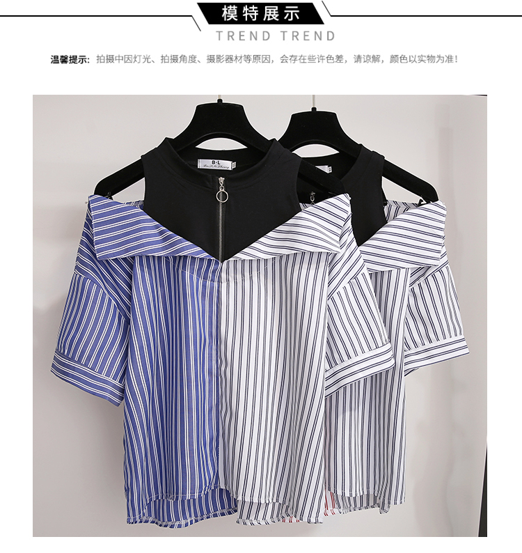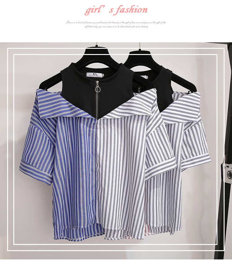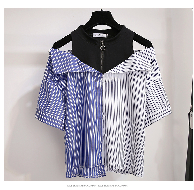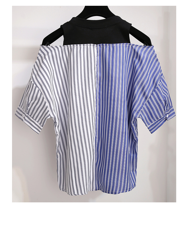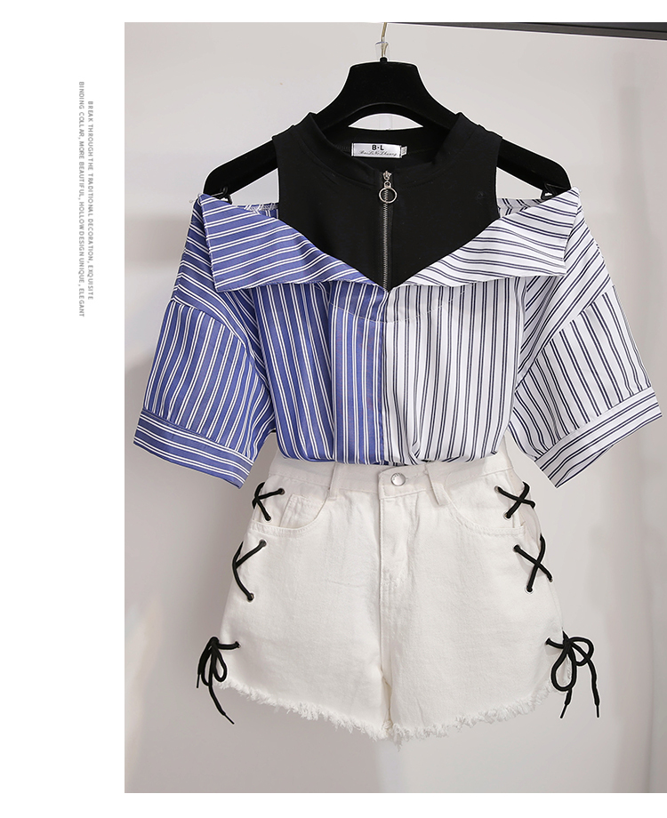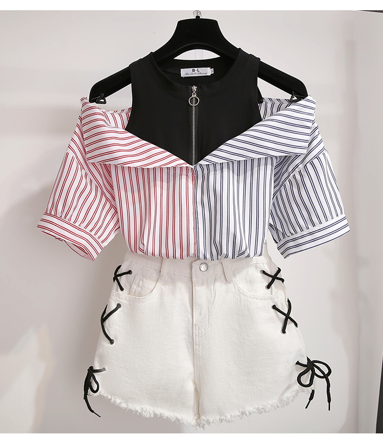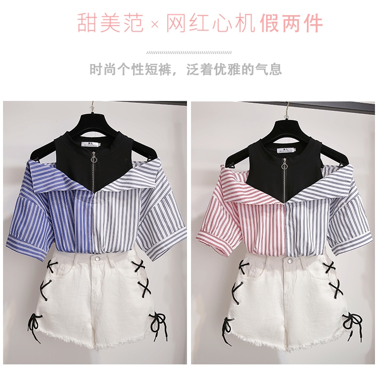 2021 summer all-match net red stitching striped short-sleeved shirt fake two-piece off-the-shoulder top women's jeans two-piece set