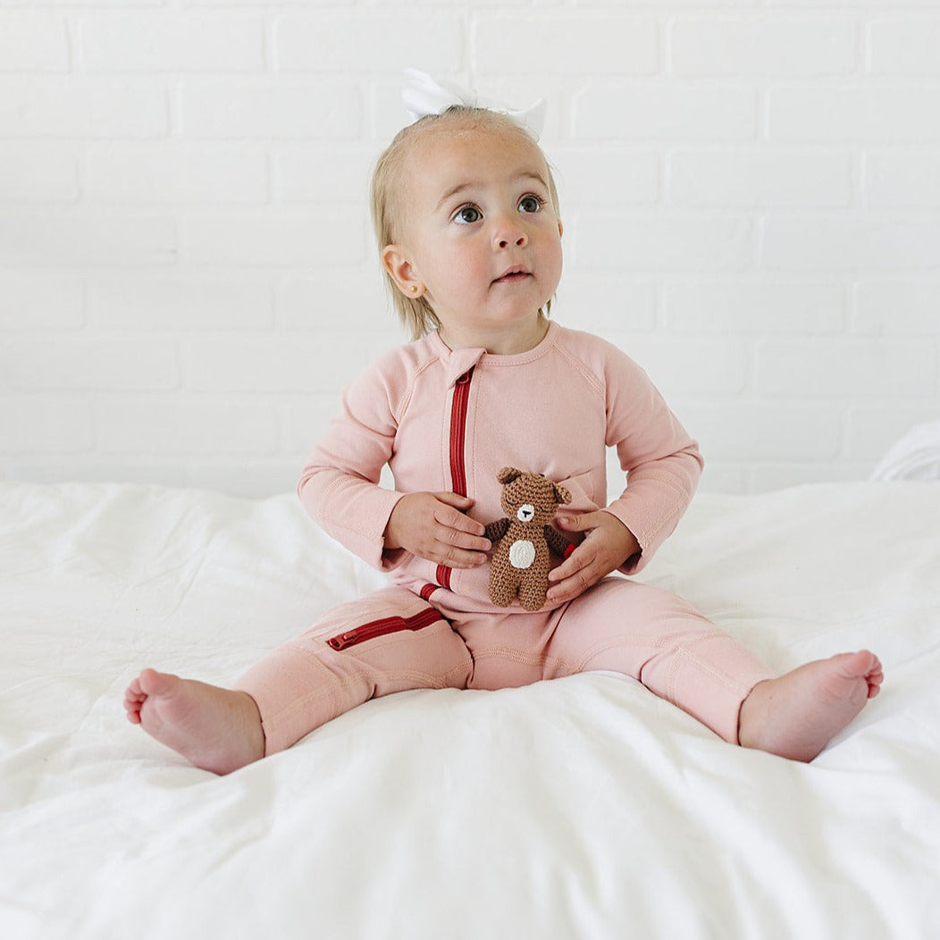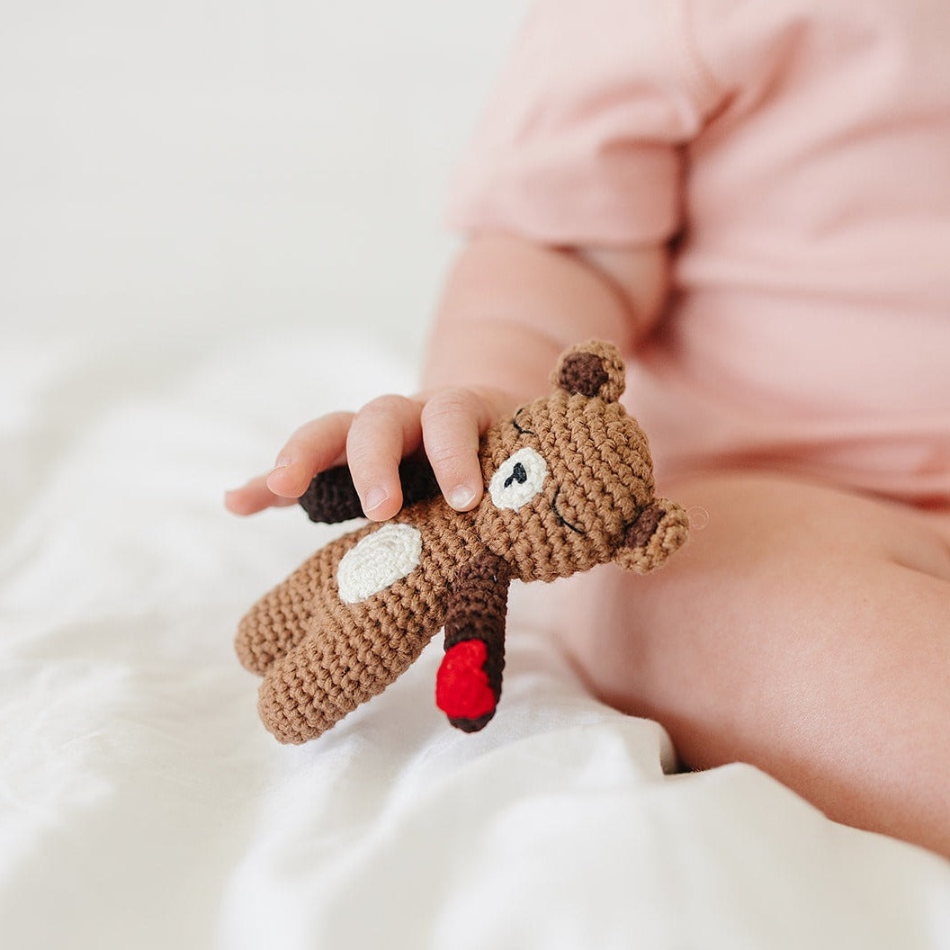 Meet our lovely crochet friend, Bear, wearing his heart on his sleeve, literally! Hand-knitted with premium 100% cotton yarn, this Pocket Pal meets or exceeds all US safety standards. With a snap button on its back, it easily attaches to any Our Little Treasures apparel, making it the perfect companion for all your little one's adventures.