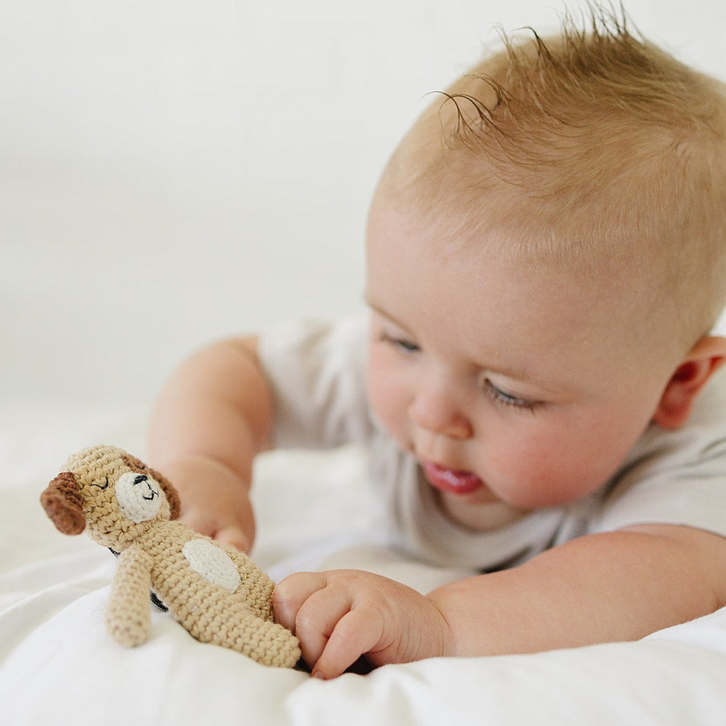 Meet our fun-loving crochet friend, Puppy, playing with his favorite bone toy. Hand-knitted with premium 100% cotton yarn, this Pocket Pal meets or exceeds all US safety standards. With a snap button on its back, it easily attaches to any Our Little Treasures apparel, making it the perfect companion for all your little one's adventures.